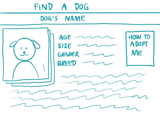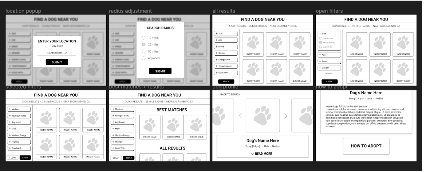 For this step of the design sprint, I focused on creating an expanded storyboard of the 3-panel sketches that were done on day two. This series of lightweight wireframes takes users through the general process of finding a dog based on certain parameters within their city.
