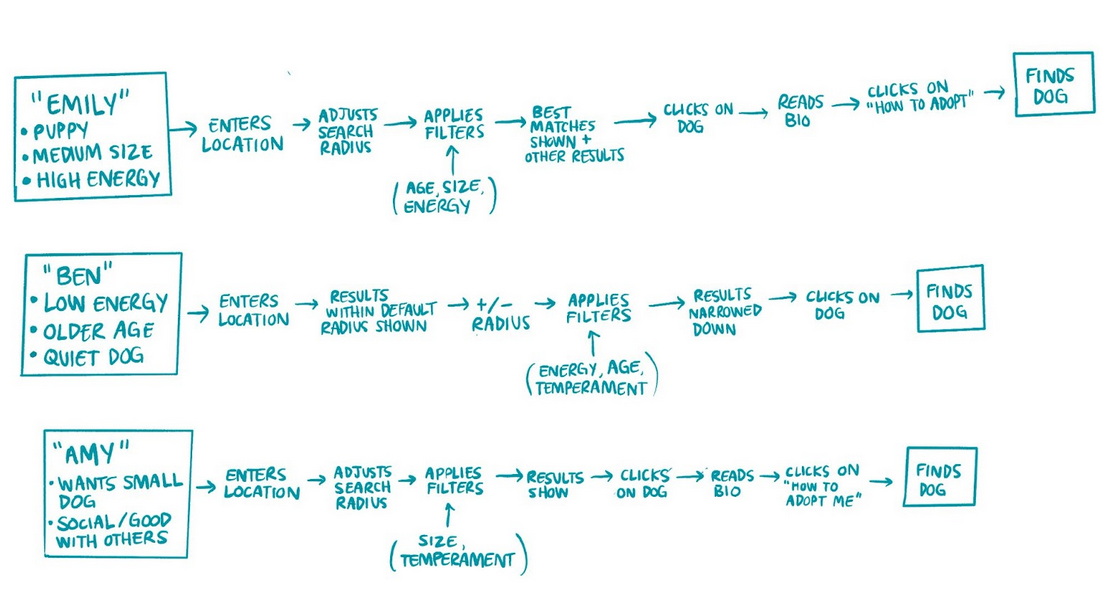 I spent most of my time analyzing the similarities between the ten users shown to me in the presentation. Across the board, many of them seemed to prioritize both the instant connection seen in photos, and the size of the dog, equally. Beyond this, many users also felt frustrations that occurred when they viewed a dog online and found a less-than-ideal “bio” written up for them. The users feel a strong desire to truly get to know a dog’s personality/social habits before adopting; the lack of information presented made the process of selecting a dog difficult.