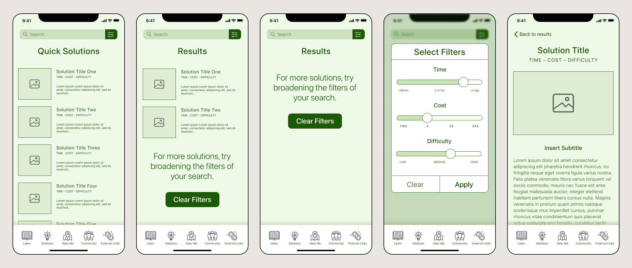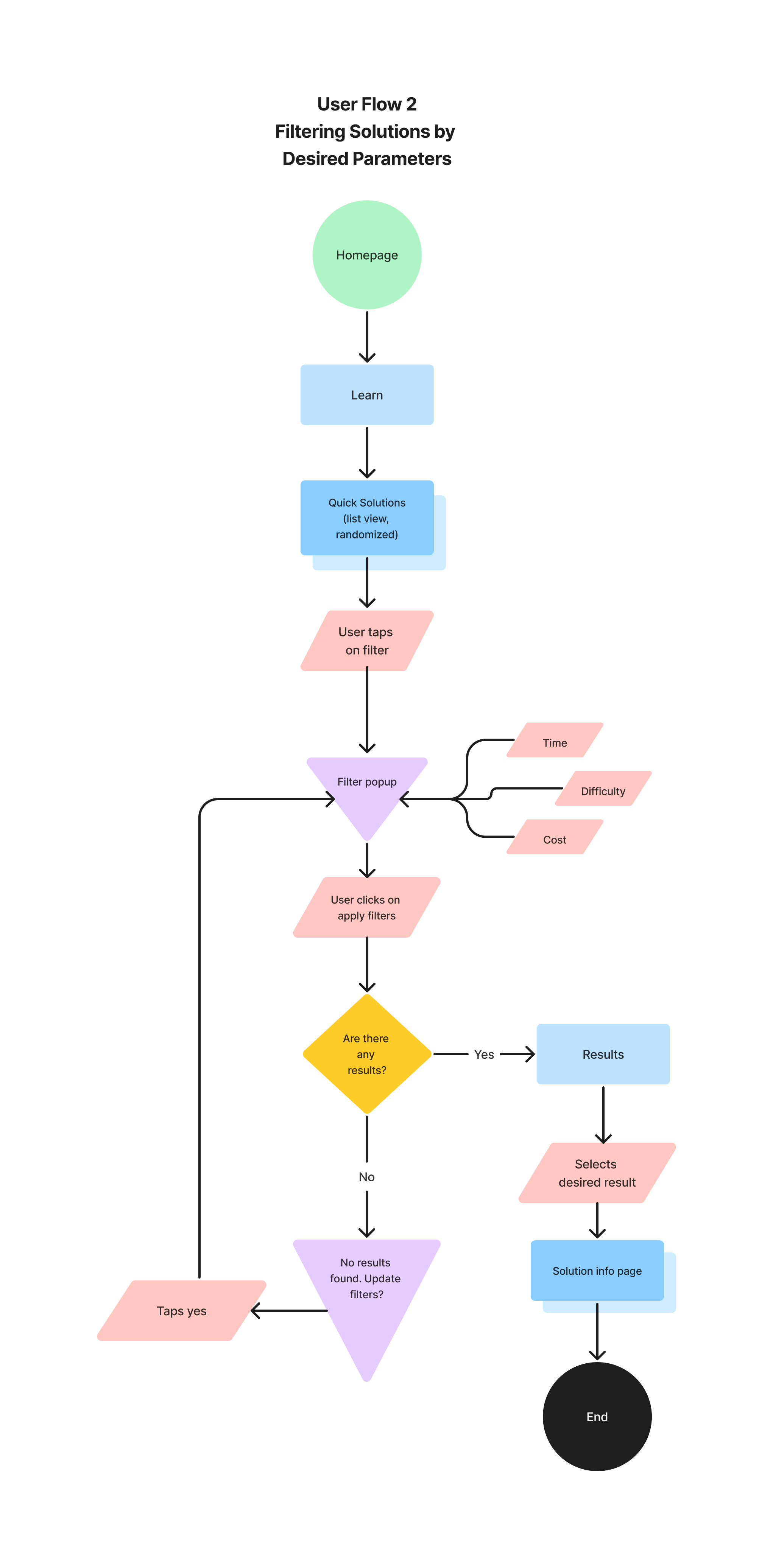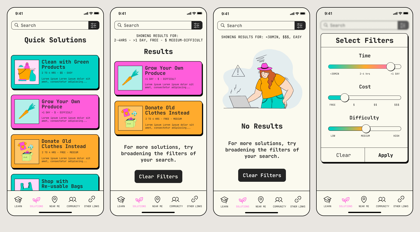 Secondly, users struggled to efficiently complete the task of finding a quick and free solution that takes less than one day to perform. Despite the availability of filters at the top of the screen on the solutions page, all five users in the testing round either individually read through the solutions or scrolled and skimmed through them, indicating that the filters were not effectively utilized.