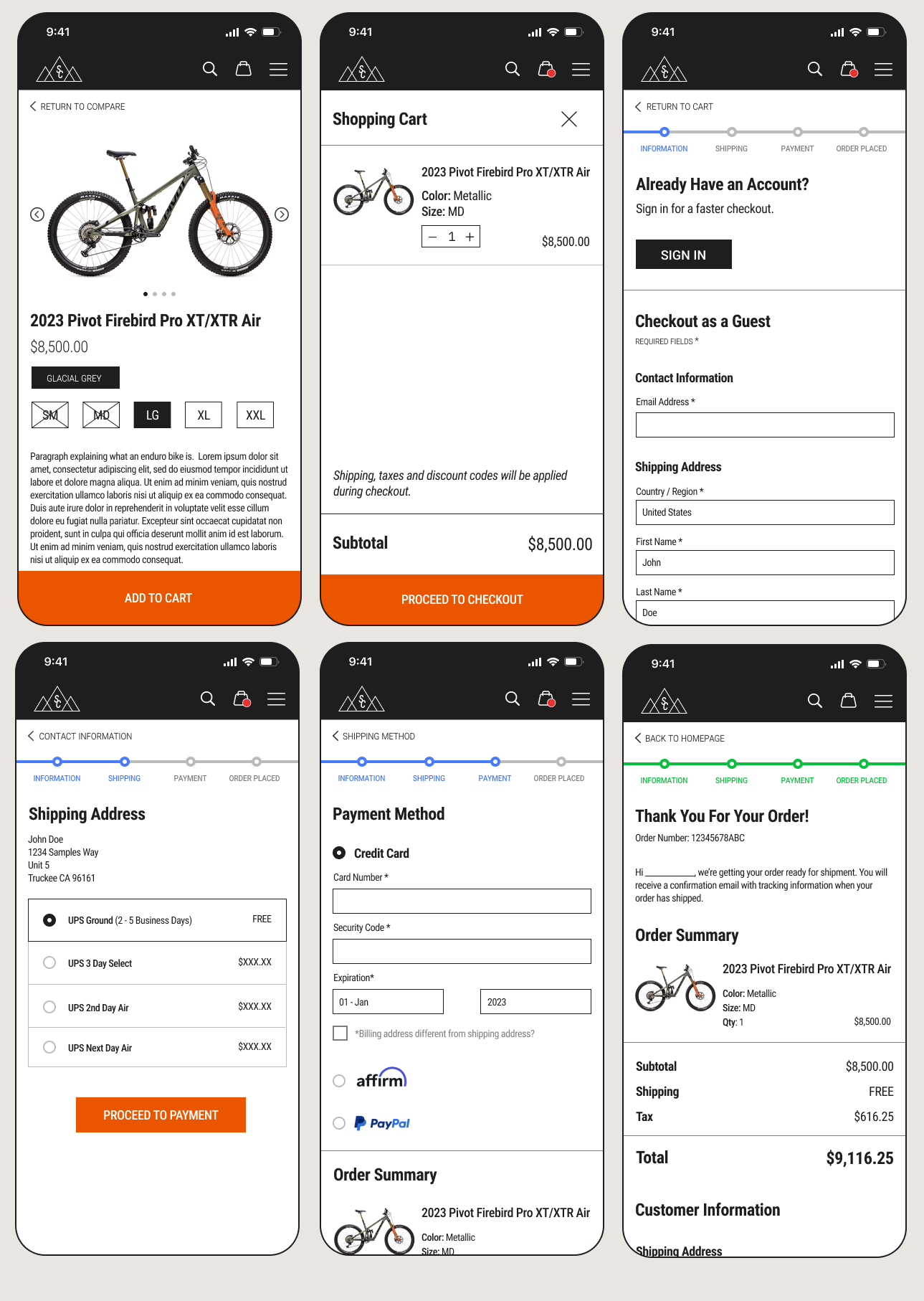 From my chosen user flows, I started by sketching out a series of screens for potential wireframe concepts. These initial sketches were put through a round of usability testing to ensure that my rough outline for usage of the Summit Cycles mobile site was as intuitive as possible for users. Below are the two user flow wireframes that I created: