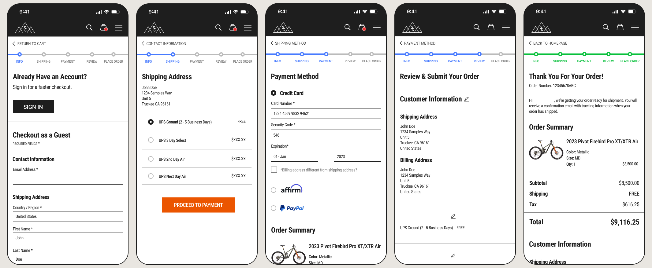 The final addition to this flow was a screen that offered the last confirmation of the following: customer information, shipping choices, payment, and cart quantities before the user submits their order. The addition of this screen gives customers a final opportunity to make edits to any of their entered information, ultimately, giving them a stronger sense of control and trust. This also required that I add another step into the progress tracking bar at the top of the screen in the UI.
